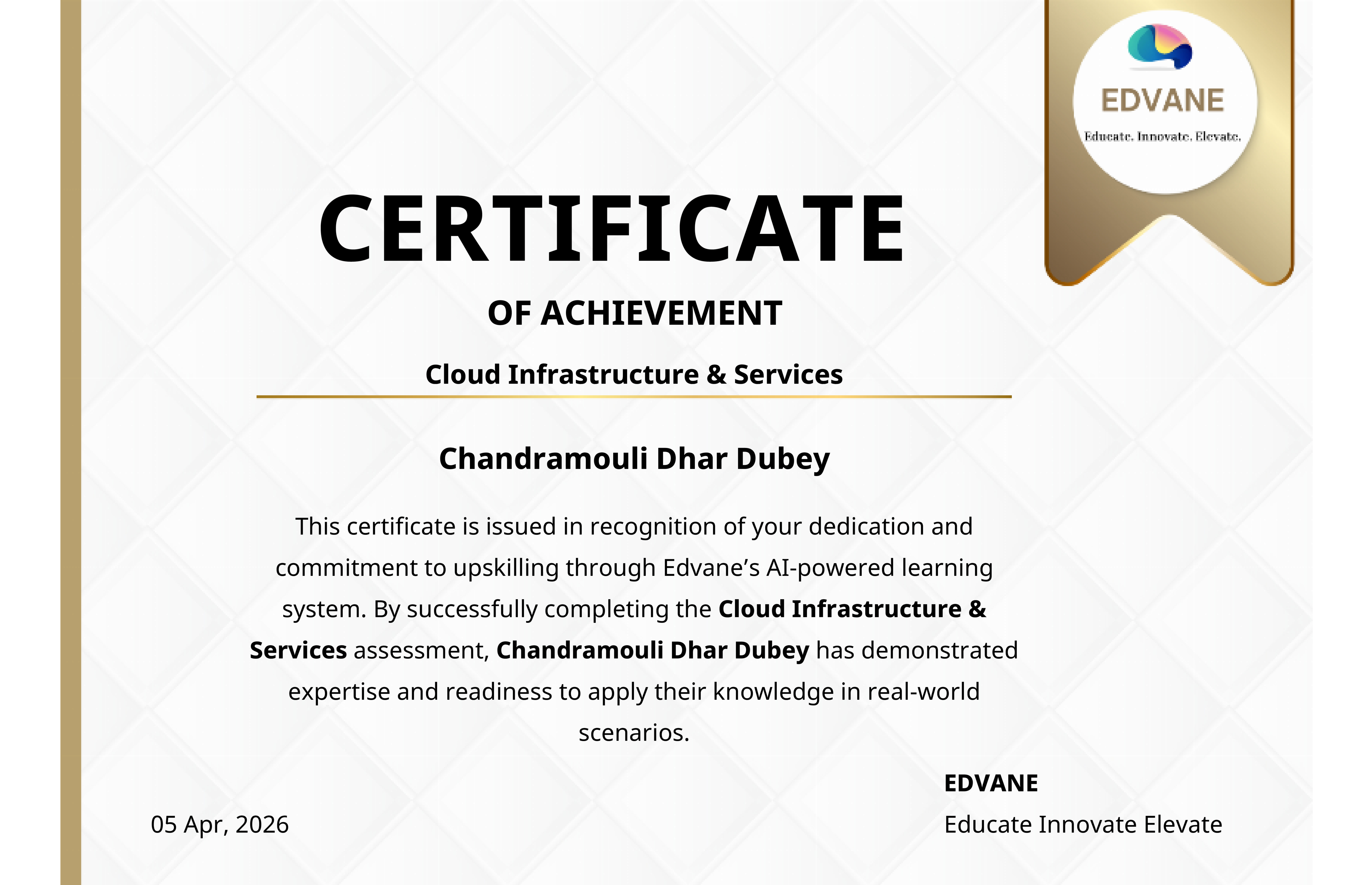 This certificate verifies that Chandramouli Dhar Dubey has successfully completed the AI-driven assessment for on Cloud Infrastructure & Services through Edvane. The certificate confirms that the recipient has demonstrated proficiency in the subject by meeting the required assessment standards, evaluated through Edvane’s intelligent assessment system.